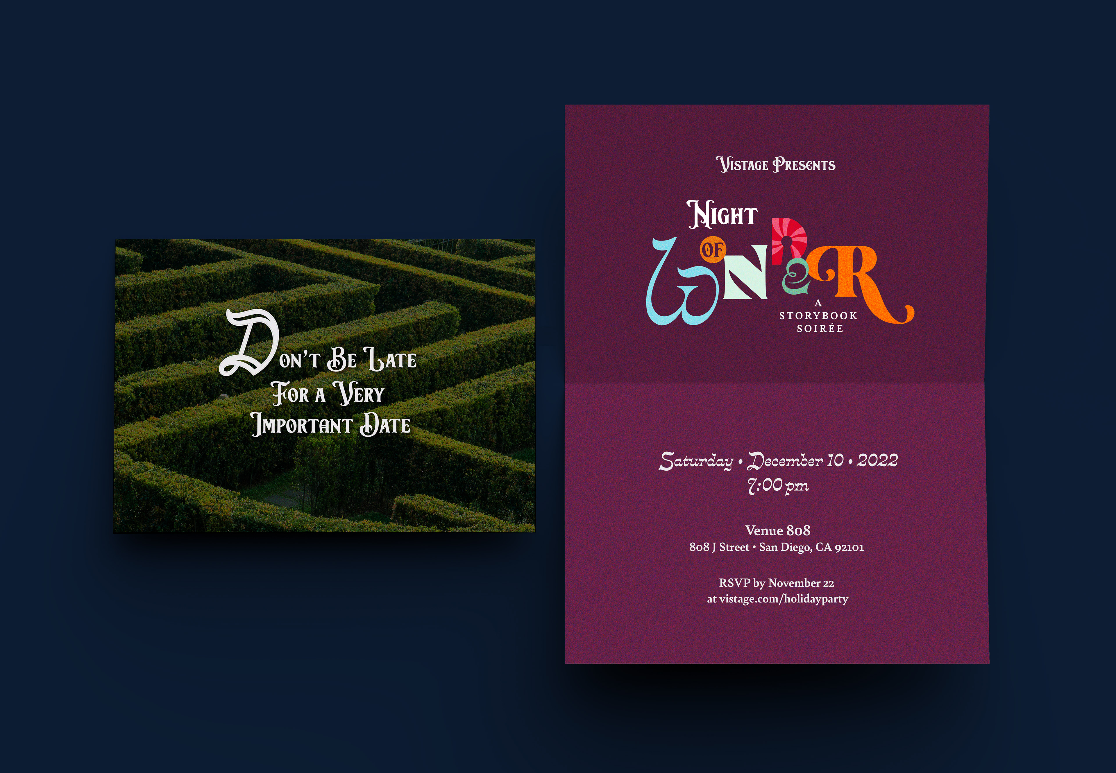 For Vistage’s 2022 company holiday party, the brief was to create a theme loosely inspired by Alice in Wonderland — whimsical, festive, memorable — while maintaining their elevated brand standards. I led the concept-development of “Night of Wonder,” defining a visual identity that balanced fairytale magic, holiday cheer, and sophistication. Leaning into rich jewel tones, a playful mix of typography, and hedge maze textures evoked a storybook experience reminiscent of Alice's world without being too literal. Assets were rolled out across print and digital channels, teasing the event's theme and immersive experience to come. It felt magical, elevated, and deeply memorable — helping to reinforce Vistage’s company culture and secure its status as one of San Diego's "Best Places to Work."